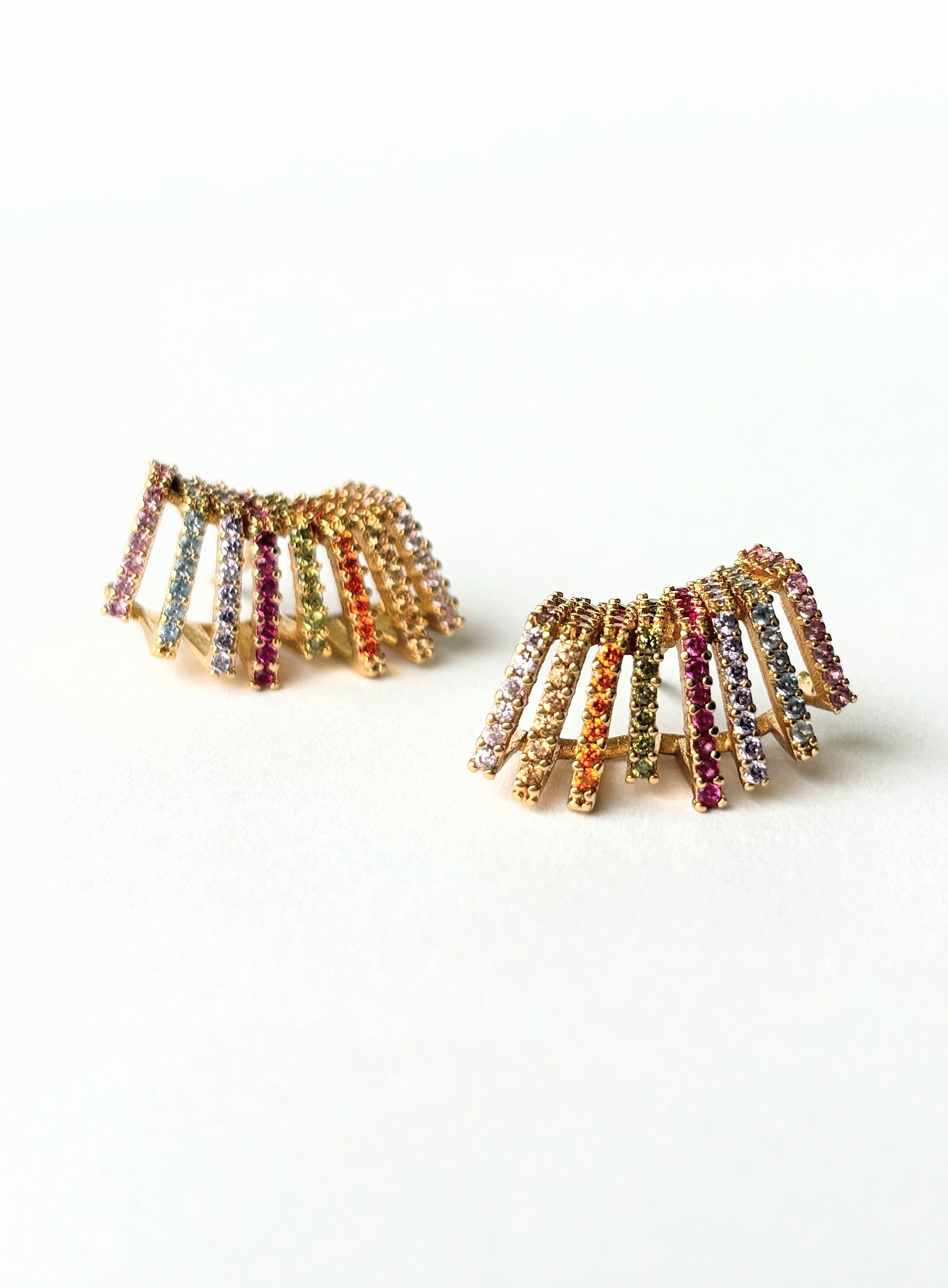 O Brinco Cora é pequeno, delicado e encantador, com linhas coloridas que iluminam a orelha com sutileza. Seu design lembra o estilo ear cuff, trazendo um toque moderno sem perder a sofisticação. Perfeito para quem busca uma joia versátil: combina com produções leves do dia a dia e também com looks mais elaborados à noite, sendo ideal para mixar com colares rivieras para destacar sua beleza natural.